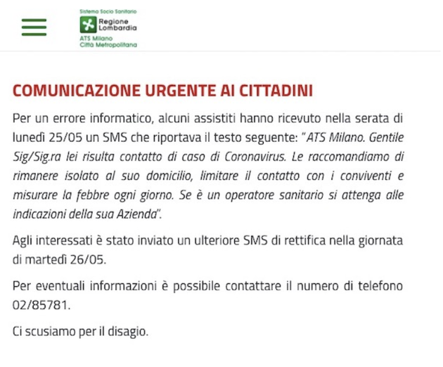 “Per un errore informatico, alcuni assistiti hanno ricevuto nella serata di lunedì 25/05 un sms che riportava il testo seguente: ‘Ats Milano. Gentile Sig/Sig.ra lei risulta contatto di caso di coronavirus. Le raccomandiamo di rimanere isolato al suo domicilio, limitare il contatto con i conviventi e misurare la febbre ogni giorno. Se è un operatore sanitario si attenga alle indicazioni della sua azienda’”. Questa la comunicazione urgente ai cittadini apparsa sul sito dell’Ats di Milano.