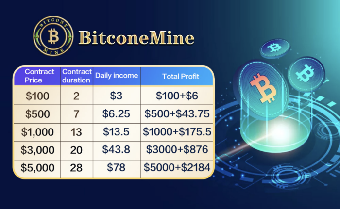2. BitconeMine offre attualmente una varietà di pacchetti di contratti tra cui scegliere, ognuno con un ritorno sull’investimento, una durata e un reddito giornaliero unici.